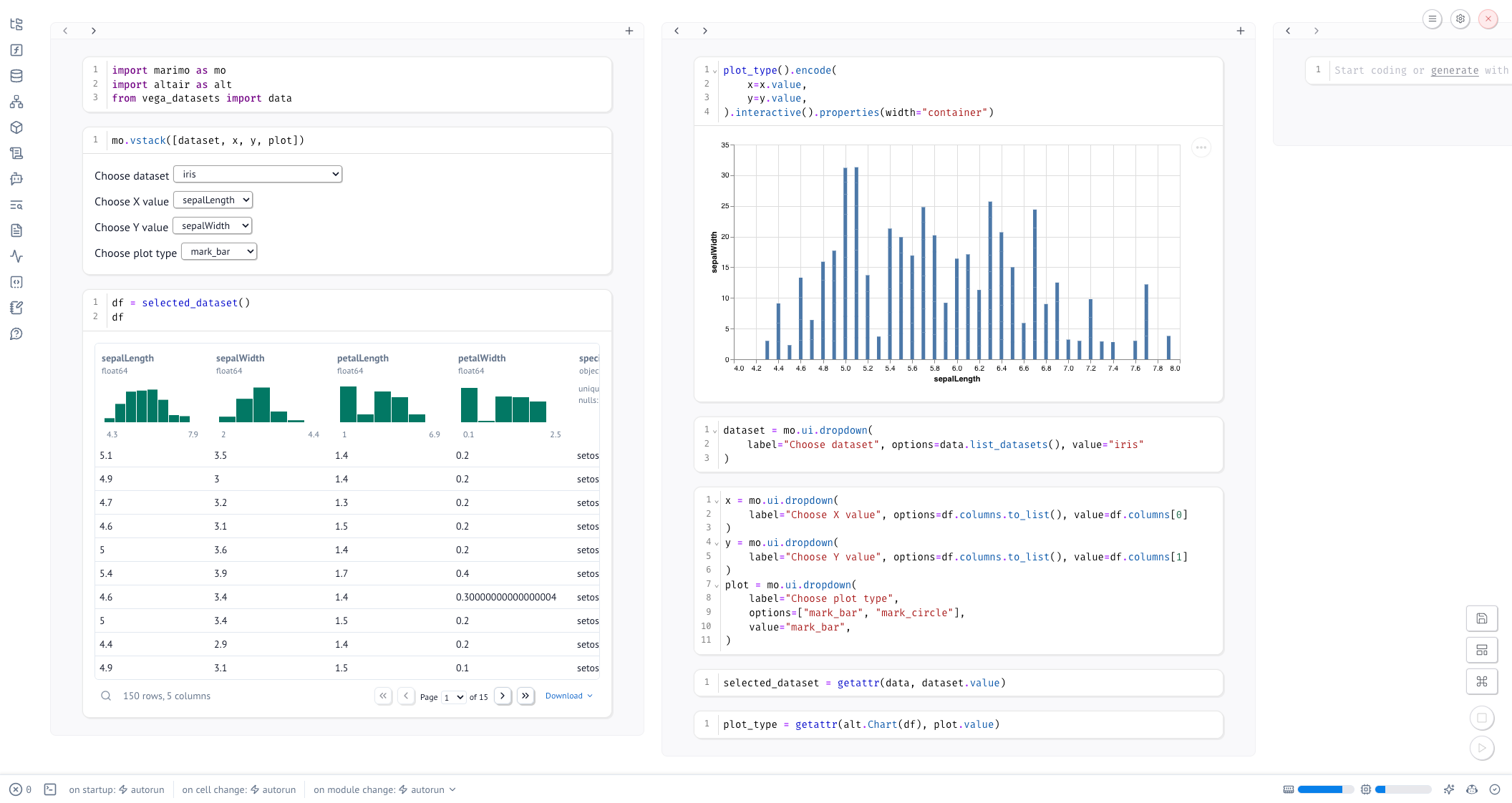 • Multi-column: Splits your notebook into multiple columns, letting you view and edit cells side-by-side. This is only possible because marimo models your notebook as a directed acyclic graph (DAG) and the execution order is determined by the relationships between cells and their variables, not by the order of cells on the page.